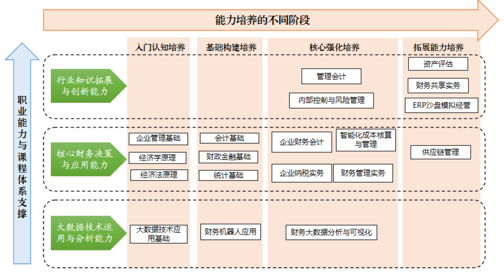从人才培养目标出发,以职业素质为基础,以专业核心能力培养为主线,在对大数据与财务管理领域工作过程与内容进行广泛了解和深入分析后,依据行业所具有的财务大数据分析、全面预算管理、智能成本管理、投融资管理、税务风险管理、财务机器人应用等对应工作岗位,所涵盖的技术与管理知识,以及对高职毕业生的具体岗位能力要求,确定学习内容。按照“以能力为本位”的课程观,依据入门认知能力、基础构建能力、核心能力与拓展能力等能力进阶规律,构建“基础课—核心课—拓展课”三层递进式课程体系,课程体系注重模块间纵向递进与横向协同:基础课程为财务会计、财务管理等核心能力提供支撑,核心课程则通过技术融合与财务技能实践强化应用能力,拓展课程进一步延伸财务工作的深度与广度,形成“基础—深化—创新”的螺旋上升路径。实践环节贯穿始终,通过实验、实训、项目开发促进知识向技能转化,覆盖财务大数据分析、预算管理、投融资管理、成本管理、税务管理、风险管理、财务机器人应用等就业方向,确保毕业与就业无缝衔接,培养符合产业需求的高技能人才。