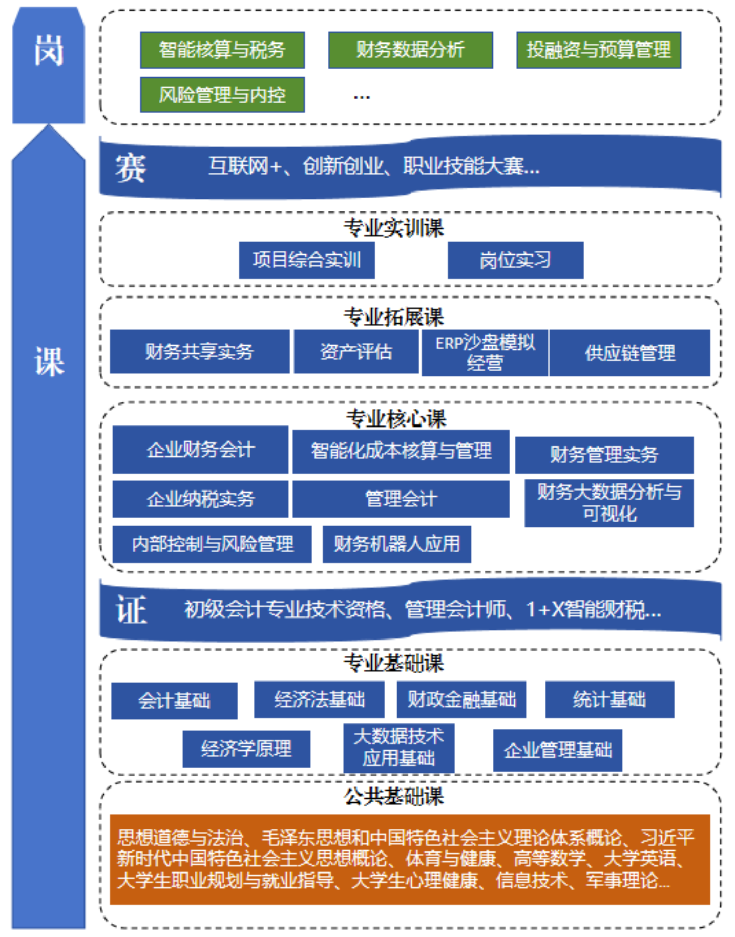 ①基础会计 ②企业财务会计 ③经济法基础 ④财务机器人应用 ⑤企业纳税实务 ⑥财政金融基础 ⑦财务共享实务 |